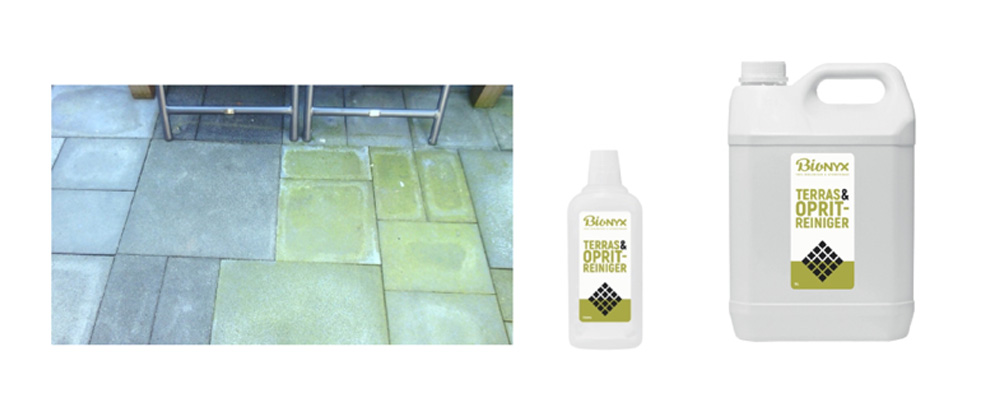 BIOnyx bevat uitsluitend hoogwaardige biologische schoonmaakmiddelen zonder chemicaliën en het gebruik is vrij simpel. Allereerst is het zaak om het schoonmaakmiddel te verdunnen met lauw/warm water. De verhouding hiervan kan variëren. Voor één eenheid BIOnyx terras- en oprit reiniger neem je één tot drie eenheden water. Vervolgens doe je dit mengsel in een vernevelaar en breng je dit aan op een droge of licht vochtige ondergrond. Dan begint het harde werk, maar niet heus. Immers, na 2 tot 3 dagen zijn de eerste resultaten al zichtbaar. Uiteraard werkt dit niet zo wanneer het gaat regenen vlak nadat het is aangebracht. Ook in de volle zon zullen de resultaten minder zijn.