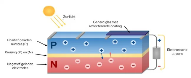 Zonne-energie wordt gegenereerd door middel van het fotovoltaïsch effect, dat geïntegreerd is in een fotovoltaïsch paneel, ook wel bekend als een zonnepaneel. Het paneel bestaat uit zonnecellen, die op hun beurt uit verschillende lagen monokristallijn silicium en chemische stoffen bestaan. Deze lagen vormen een structuur van negatief geladen elektronen en positief geladen ruimtes. Wanneer de zon begint te schijnen, worden de negatief geladen elektronen in beweging gebracht en geduwd in de richting van de positief geladen ruimtes. Deze ruimtes leiden de stroom van elektronen vervolgens naar een lichtbron of naar een batterij, waar de energie wordt opgeslagen totdat deze gebruikt kan worden. Hieronder is een schematische weergave van het fotovoltaïsch effect te zien.