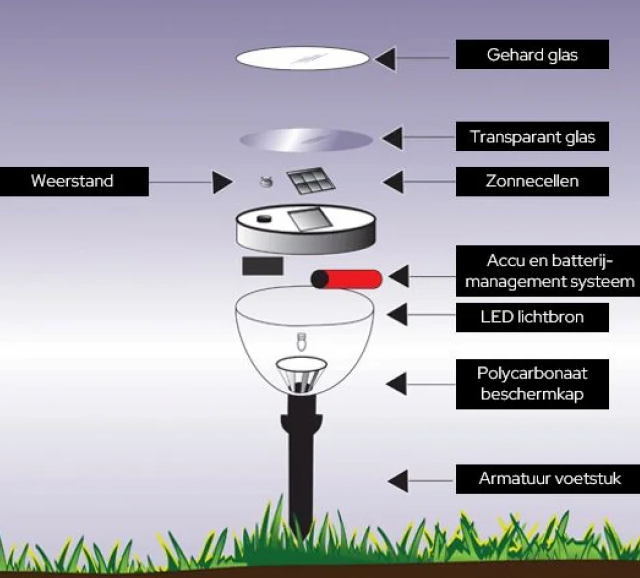 ◾Het batterijbeheersysteem Om de energie zo efficiënt mogelijk te benutten, is een geavanceerd batterijbeheersysteem (BMS) geïntegreerd. Het BMS zorgt ervoor dat de lichtbron geleidelijk de accu ontlaadt en automatisch wordt ingeschakeld bij schemering en uitgeschakeld bij daglicht. Op deze manier wordt energie niet verspild wanneer dit niet nodig is. Bovendien regelt het BMS de kracht van de lichtbron efficiënt. Bij een afnemende acculading zal de lichtbron automatisch dimmen. Dankzij dit geavanceerde systeem kan een solar lamp moeiteloos de hele nacht branden op een volgeladen accu.