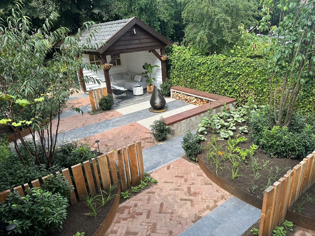 In Arnhem realiseerde Ruinard Hoveniers een mooie stadstuin met een overvloed aan groen. ‘We investeren bewust in grotere, meerstammige bomen, zodat de tuin na drie maanden al heel volwassen aanvoelt,’ zegt Frank Ruinard. Vanuit zijn eigen ontwerpstudio Studio Ruinard, werd een 3D ontwerp ontwikkeld. ‘De klant had minimale wensen, waardoor we veel creatieve vrijheid kregen. Ruinard is tevreden over het samenspel van materialen, waarbij de kleurcontrasten van cortenstaal, het kleurenpatroon in de verharding en vergrijsd hout in combinatie met de groene beplanting zorgen voor een originele stijl.