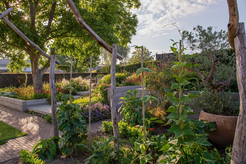 Opvallend is de combinatie van weelderige beplanting met hoogwaardige materialen, zoals de zwevende trap van grootformaat Schellevis-tegels en een antieke badkuip die als minivijver dient. Ondanks de vele erfgrenzen is er rust gecreëerd met duidelijke zichtlijnen en looppaden. Het contrast tussen de strakke lijnen en de rijke beplanting wordt versterkt door een rijke variatie in kleur, geur en smaak. Die smaak komt letterlijk terug in de tuin: tussen de sierplanten groeien tomaten, aardbeien en andere eetbare soorten. Ook de notenboom draagt daaraan bij.