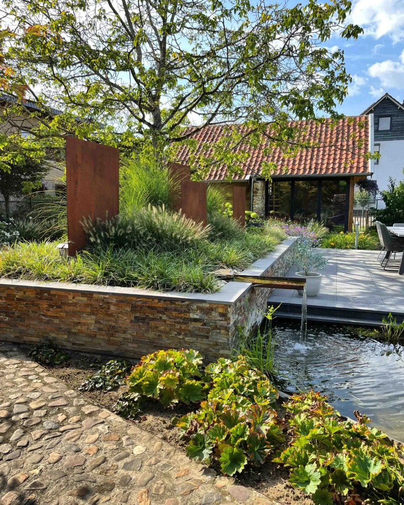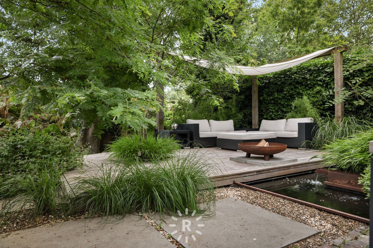 De gedeelde derde plaats ging naar De Rooy Hoveniers en Ruinard Hoveniers. In Gorinchem ontwierp De Rooy een beschutte stadstuin met een ingenieuze waterpartij. Door een smalle goot beweegt het water zich vanaf de woning langs diverse elementen en beplanting naar de vijver achter in de tuin. ‘Met dit ontwerp creëer je verbindingen die de tuin tot een kloppend geheel maken,’ legt ontwerper Yvonne Kieboom uit. Houten stapelementen en een speels gelegd pad van hergebruikte Schellevis-tegels naar het vlonderdek dragen hieraan bij.