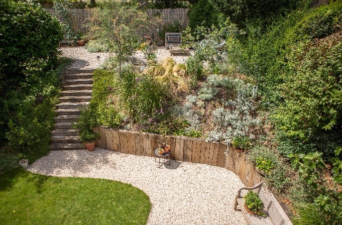 "Dit ontwerp biedt fijne plekken om de tuin te ervaren in al zijn kleuren en levendigheid. Door het hoogteverschil, de glooiende natuurlijke vormen en zeer gevarieerde beplanting kunnen we spreken van een zeer goed gelukte ("bio") diverse tuin."
