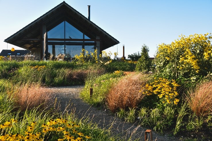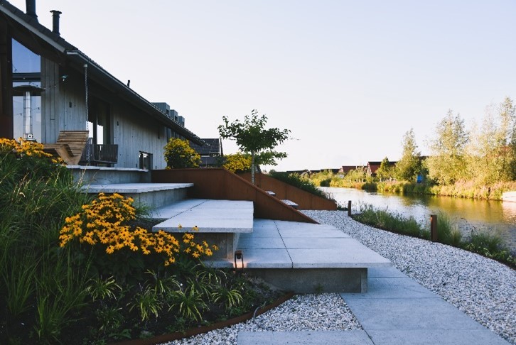 "Een groene tuin in Piet Oudolf-stijl. Organische vormen, hoogteverschillen en prachtige bloemrijke beplanting die voor vele soorten dieren aantrekkelijk is. Er is gebruik gemaakt van luxe bestratingsmaterialen in een goede balans. Dan weer glooiend en dan weer strak."