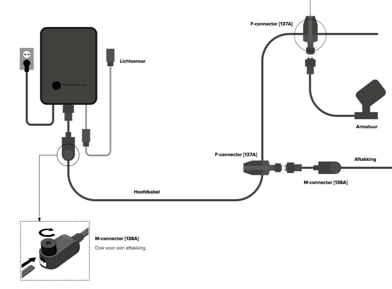 Aansluiting van de F-connector: Sluit de F-connector aan op de hoofdkabel en plaats de lampen