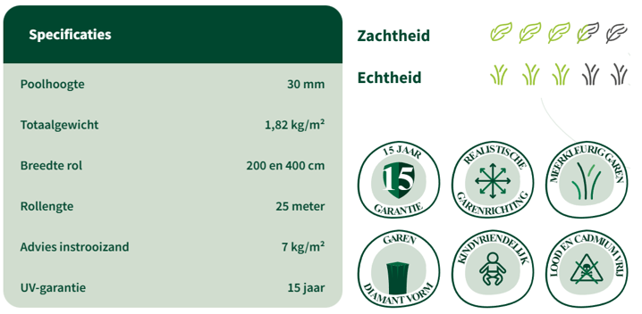 Met dit grassoort haal je een zeer kwalitatief en mooi product in je tuin. De natuurlijke uitstraling is van ongekende hoogte. Het gras heeft een poolhoogte van 30 mm waardoor het lijkt of het net gemaaid is. Het kunstgras is een innovatief product en ontwikkelt door onze eigen leverancier.
