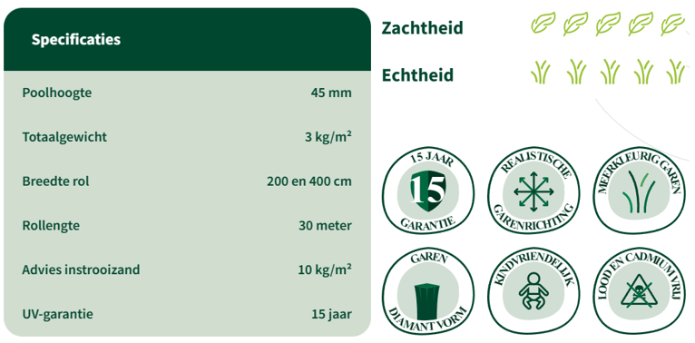 Dit kunstgras is een ware schoonheid en staat bekend om zijn elegante uitstraling en zachte vezels. Het lijkt bijna alsof het natuurlijk gras is en zorgt voor een aangename sfeer in elke tuin. De opbouw van het kunstgras bestaat uit verschillende soorten garen, waarbij de kleuren van de mosdraden en de grassprieten perfect op elkaar aansluiten.