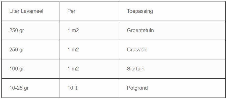 Lavameel zit vol spoorelementen en vult de nodige mineralen weer aan in uw bodem. Zeer geschikt voor: Groentetuin, grasveld, siertuin en potplanten.
