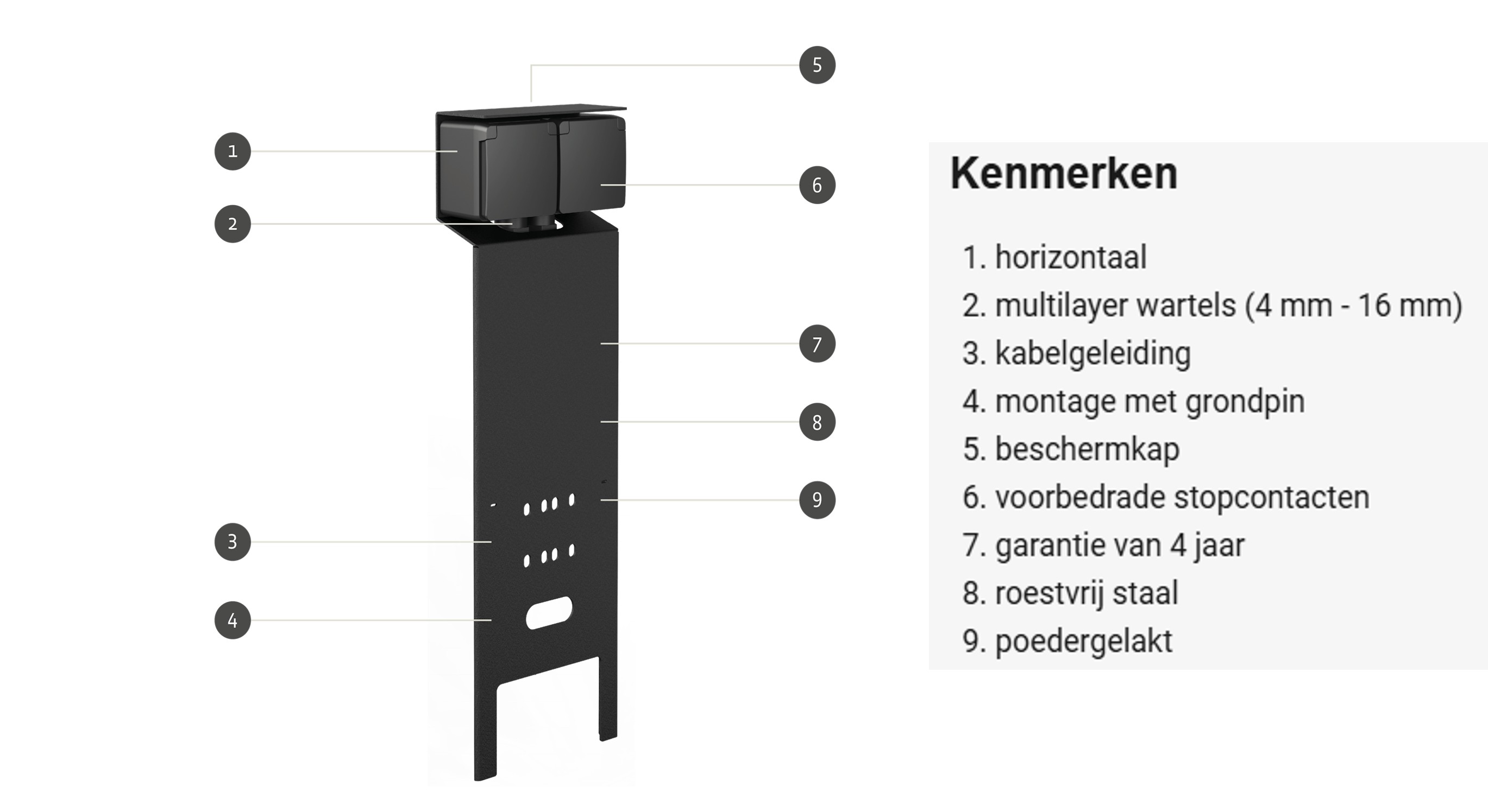 krijg makkelijk stroom in je tuin met twee voorbedrade, horizontaal geplaatste stopcontacten. Plaats de paal in losse ondergrond, zoals of gras of bloemenperken. Ideaal voor het opladen van gereedschap, werken op afstand in de tuin of het aansluiten van verlichting.