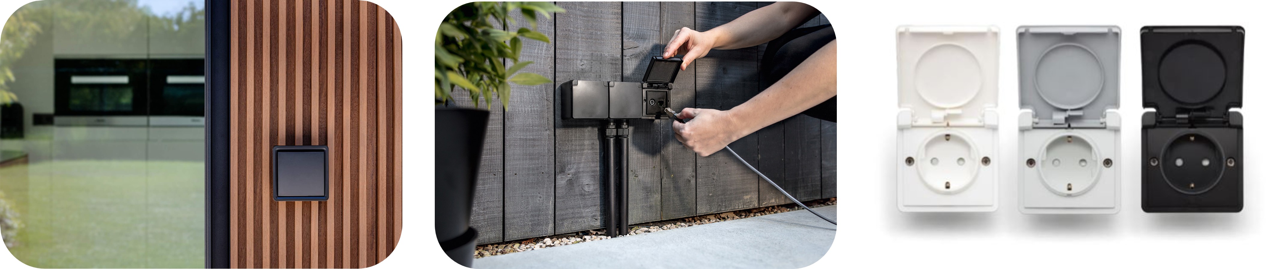 De spuitwater- en stofwerende schakelaars en stopcontacten van Niko zijn bestand tegen natte weersomstandigheden. Ze bieden de beste garantie voor veilige stroom in de buurt van water of stof.