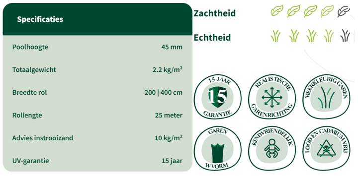 Dit kunstgras is voornamelijk bedoeld als siergazon en heeft een realistische uitstraling. Het is comfortabel en ideaal voor gebruik in de tuin of op een dakterras. Bovendien is het kunstgras Reef 45 veerkrachtig, waardoor het snel weer overeind komt als er overheen gelopen wordt.