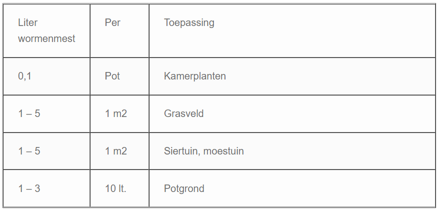 U kan wormenmest het hele jaar door gebruiken. Ook kan wormenmest tegelijk met Lavameel en kalk worden gegeven. Ook geschikt als stekgrond. Wormenmest heeft een langzame afgifte en geeft geen verbranding. Wormenmest verbeterd uw bodem op een natuurlijke manier.